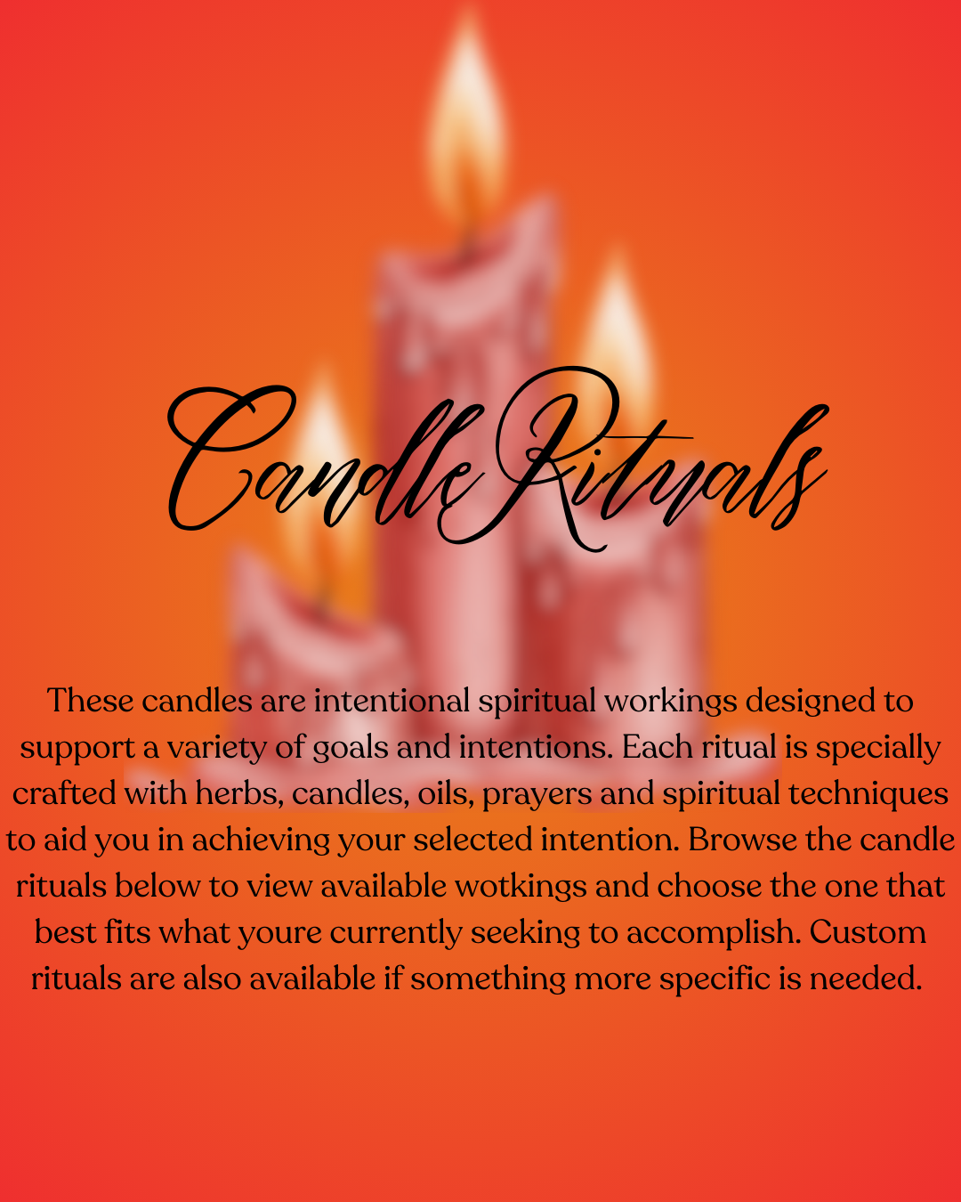 Browse the available candle rituals to explore the different workings offered. Each ritual focuses on a specific intention or situation. Click into a ritual to view details, timing, and bundle options.